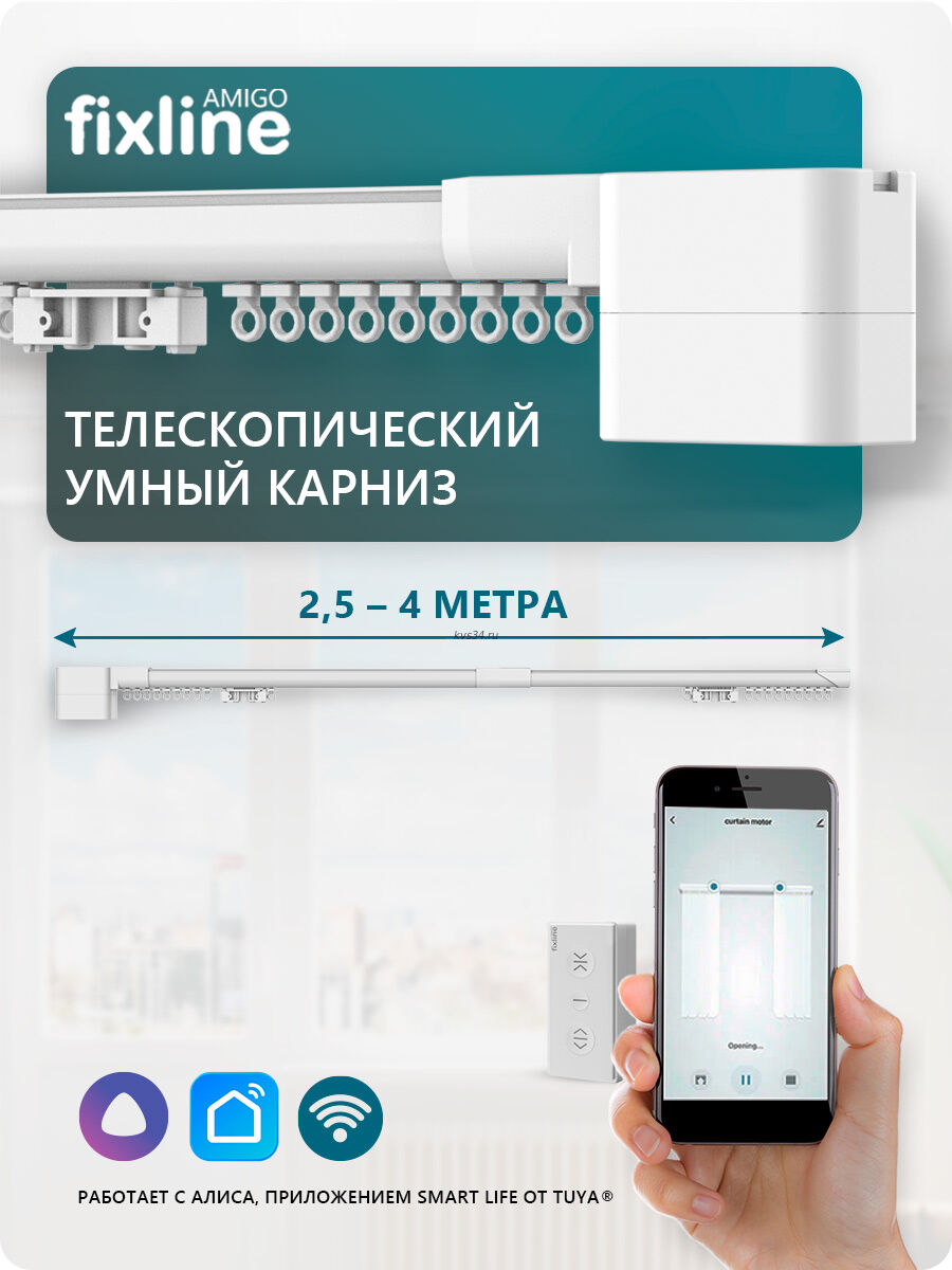 Это самый компактный моторизованный карниз из представленных на рынке. Система не требует замера, отрегулировать длину карниза можно прямо на объекте. В комплекте идет все необходимое для установки и эксплуатации изделия. Карниз оснащен компактным электроприводом со встроенным радиоприемником, а также Wi-Fi модулем, позволяющим управлять карнизом с помощью приложения Smart Life от Tuya® и голосового помощника Яндекс.Алиса.